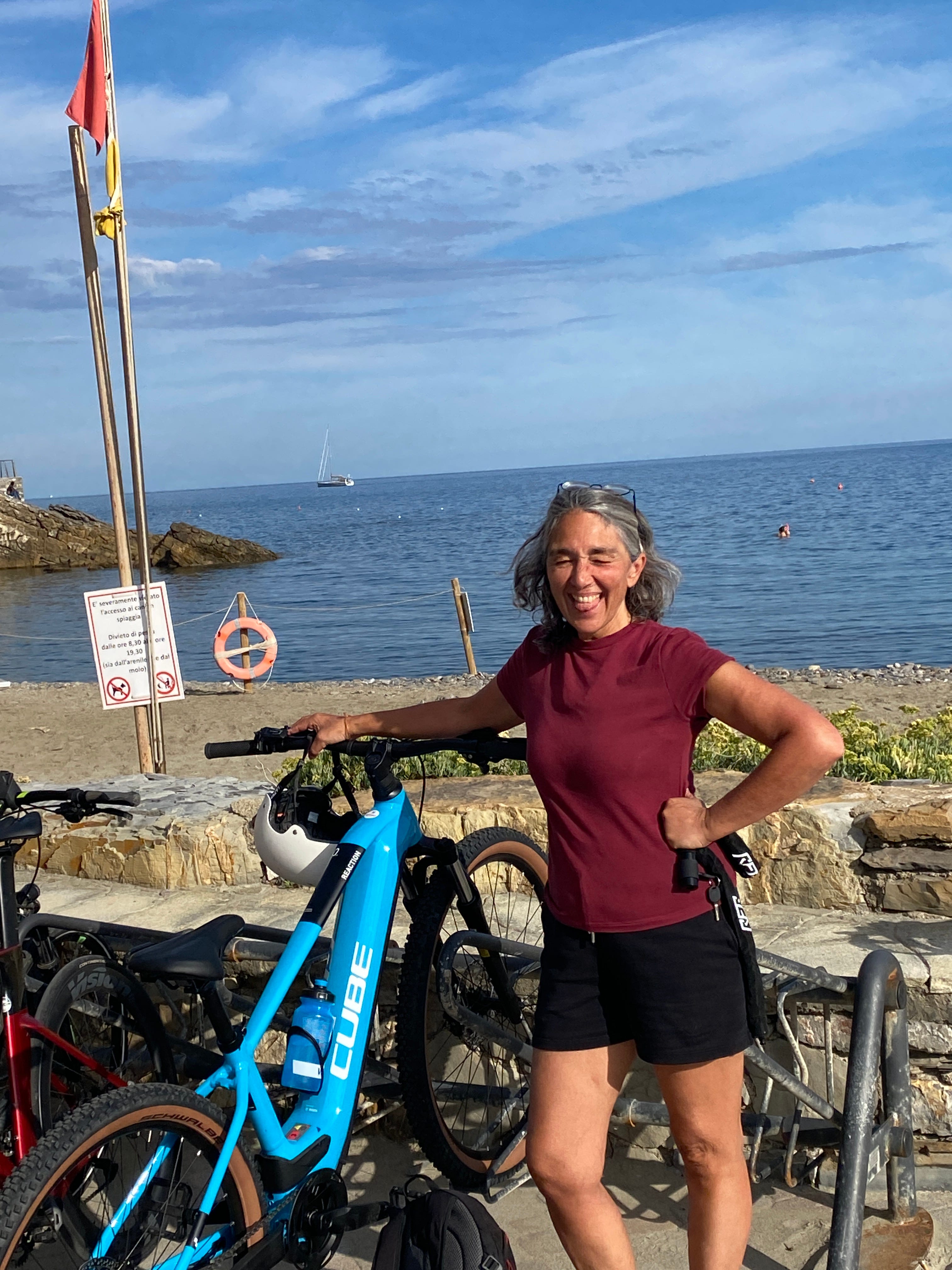 If you have never ridden an e-bike before, like me, it’s tempting to think of its potential as a slow moped, but this is not the case at all. You still need to pedal. This has been an eye opener for me. I am keeping a steady pedal (between 78-80 rotations of the pedal per minute I was instructed at the shop) and turning the boosts on for when I feel like giving up. The hills leading up into the mountain where we live are brutal and the bike made such easy work of them. I love my bike. I am now a cyclist. In the short few days of acquiring the bikes, we’ve since nipped down to Dolcedo to the commune to apply for our identity cards. The lady, Tiziana, at the commune is my friend now. She has been super helpful over the last few months and she playfully said that my new career ought to be as a thief since the finger print machine was incapable of capturing my prints. I do, I swear, have lines on my fingers, and never have I tried to erase them with acid as I once saw someone do in a crime drama on TV. Anyway, soon we will receive our ID cards, which will truly make us legit here in Italy and we will be able to do more exciting admin things like paying the rubbish tax and for our business like logging the passport info with the local police station. We also nipped all the way down to Imperia to the beach today, swam, had ice cream and a coffee at la Foce beach, all within 4 hours. I can see more nipping around trips on the horizon, like down to the shop in Dolcedo for supplies, although I want to keep some destinations for hiking only, like Monte Faudo and Valloria.